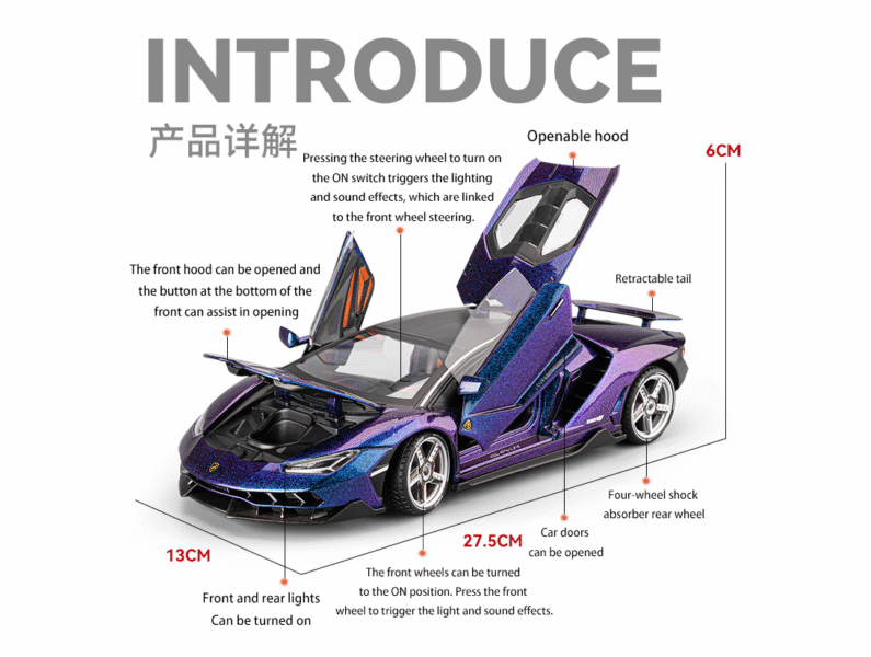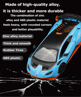 Why choose us? Our alloy models are made of zinc alloy, making the body stronger, the paint finish more effective, and the quality more premium. They are crash-resistant and drop-resistant, making them resistant to even the most mischievous vandals. They feature a variety of details, including a front-wheel-linked steering, four-wheel shock absorbers, a retractable rear spoiler, permanently lit taillights, and rear wheel retraction, allowing for multiple openings.